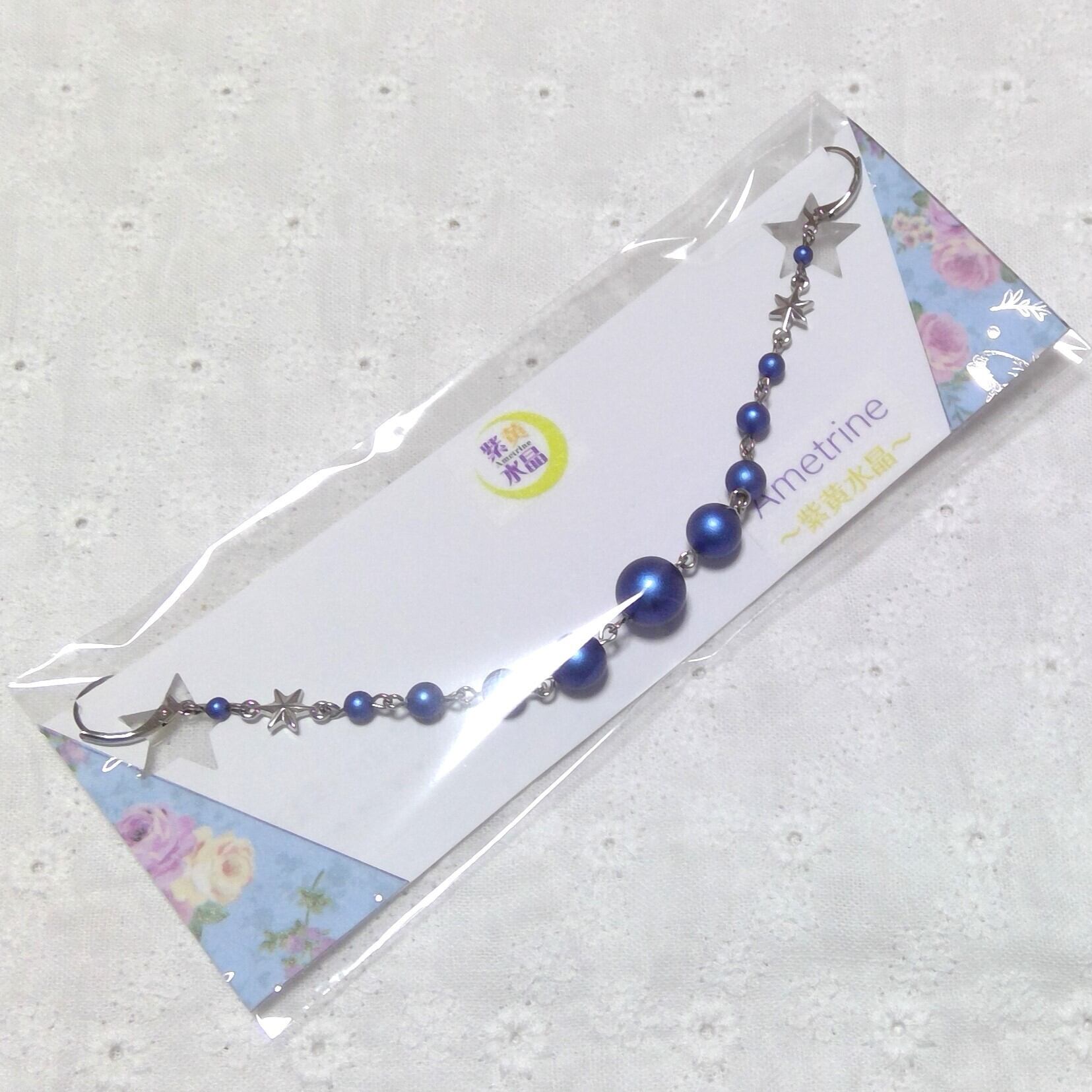 マットな光沢の濃いブルーが綺麗なガラスパールに、ロジウムカラーの星を繋げました。