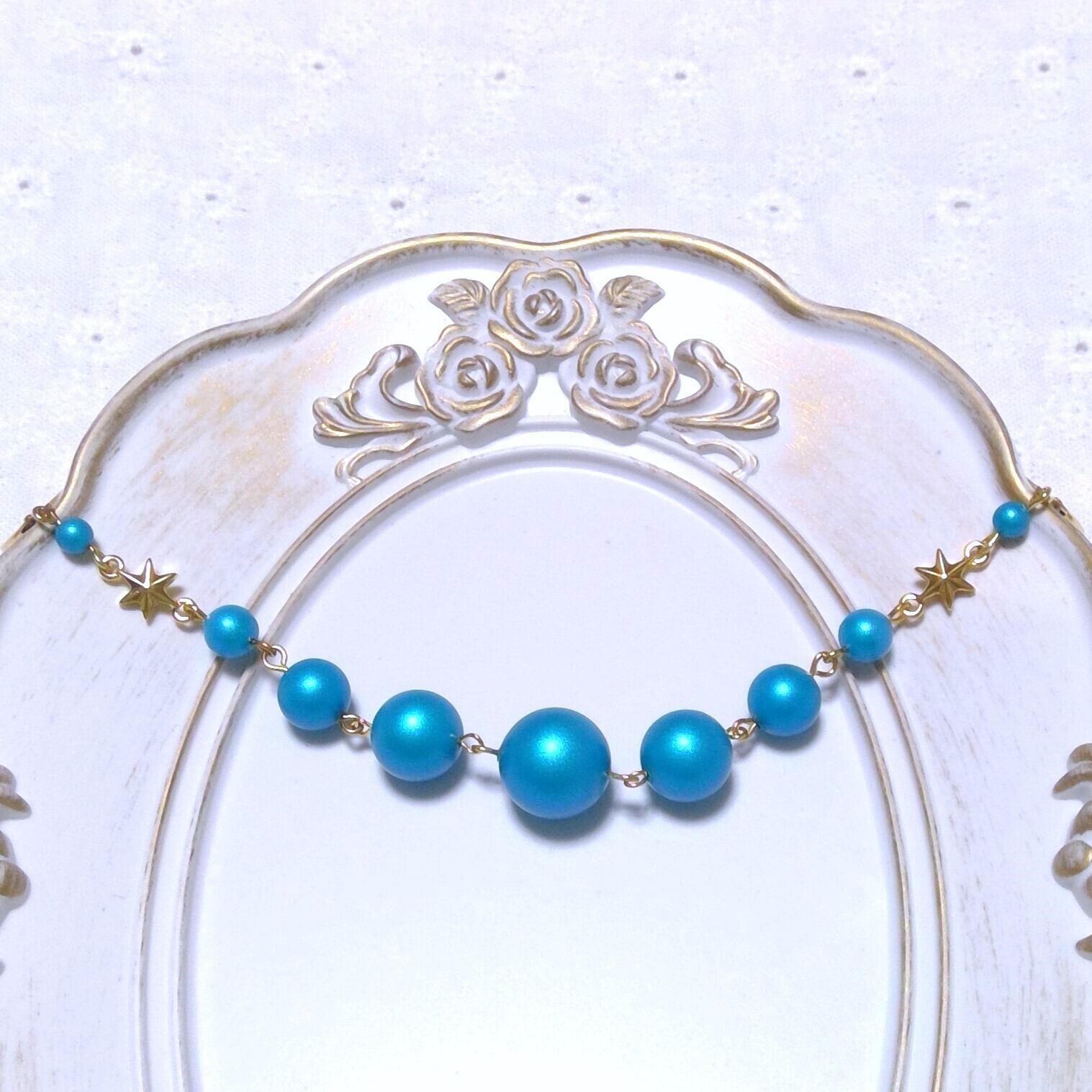 マットな光沢の青緑色が綺麗なガラスパールに、ゴールドカラーの星を繋げました。