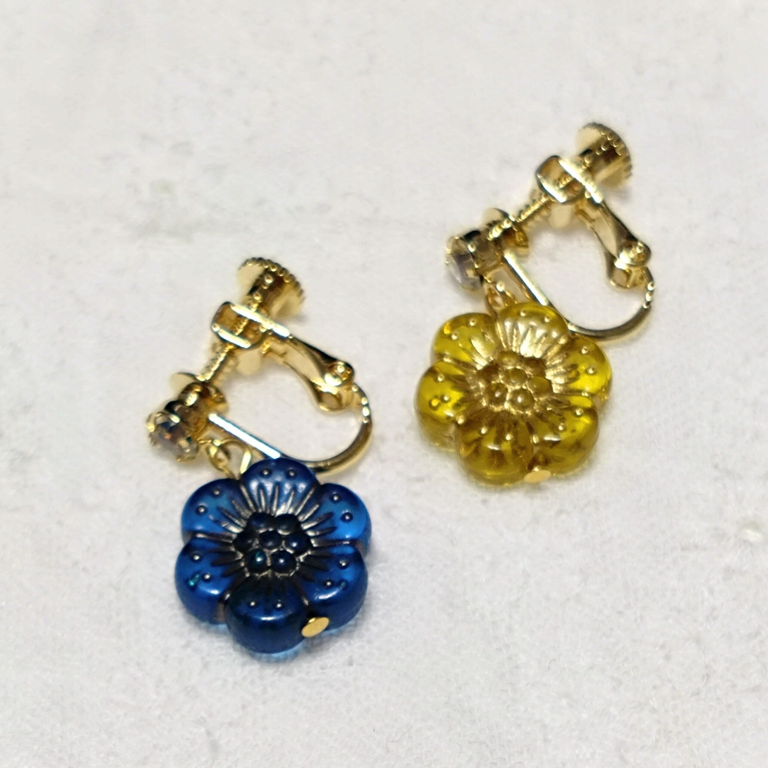 染色された鮮やかなチェコフラワービーズのイヤリングと、花のような3色のレース編みのシュシュのセットです。
